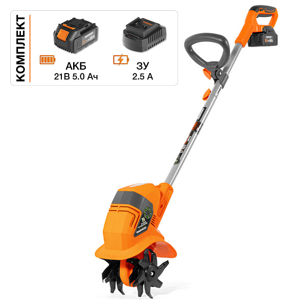 Культиватор совместим со всеми аккумуляторными инструментами и батареями DAEWOO линейки 21В.