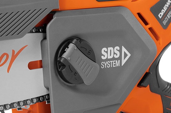 Система SDS позволяет натянуть цепь на пиле одной рукой без использования ключа. Это упрощает процесс и делает его более безопасным, поскольку исключает случайные травмы при работе с ключом.