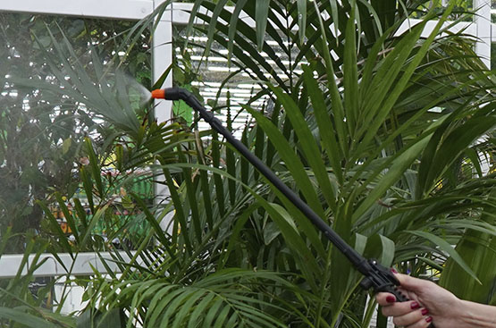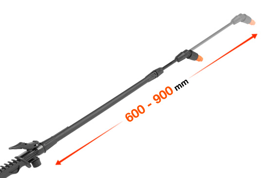 Телескопическая штанга выполнена из пластика и регулируется по длине в диапазоне от 60 до 90 см. Это позволяет опрыскивать как кустарники, так и деревья просто удлинив штангу.